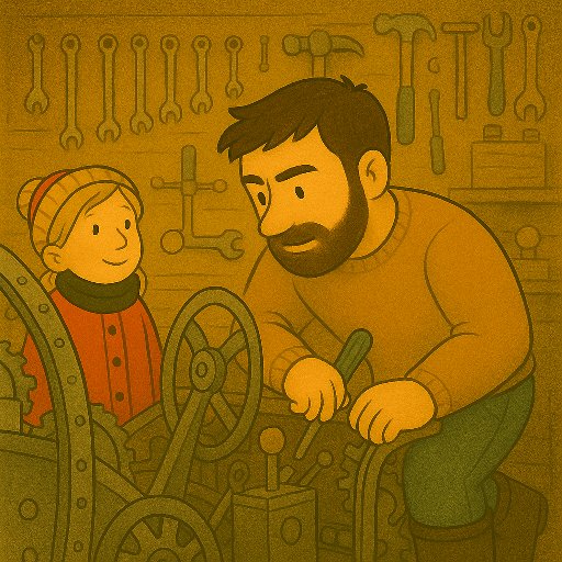 Tata Hani też imponował Kamilowi. Od jaskiń i stromych stoków wolał wprawdzie płaski, znajomy grunt pod nogami, ale i tak robił ekscytujące rzeczy! Wystarczy wspomnieć, że projektował rakiety, które później wynosiły ludzi na orbitę okołoziemską. „Mój tata jest z zawodu projektantem rakiet kosmicznych” – które dziecko nie chciałoby tak powiedzieć? A to nie wszystko. Bo po pracy tata Hani często przesiadywał w swoim przydomowym warsztacie. Podobno pracował nad wehikułem do podróży w czasie…